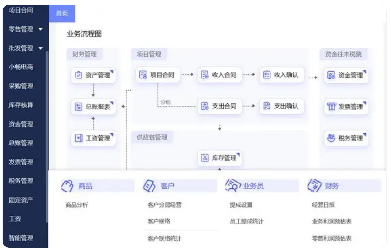 好业财是畅捷通公司的产品,属于用友集团的成员企业,旨在为中小企业提供信息化建设解决方案,通过多维度追踪实现对内部业务/项目/货品的收入、成本、毛利、费用及分摊、预算执行等管理,同时对外提供对往来单位、银行、税局、客户管理、营销玩法等多个方面的管理。以下是好业财的多个方面: