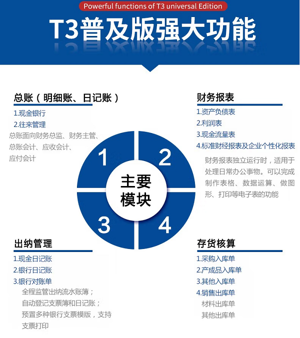 【T3-用友通普及版】包含总账、现金、往来、出纳、财务报表,也有存货核算模块。只能单机使用,只能建9套帐。不能增加站点;