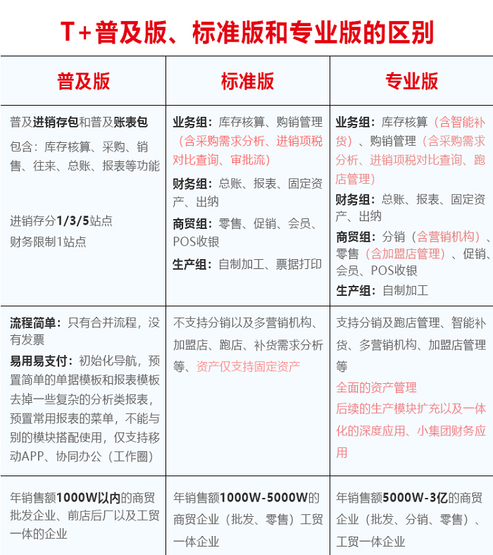 T+分为标准版、普及版、专业版,使用最多的是标准版,很少有用专业版的,因为常用的模块标准版里都有,专业版只是多了一些很少用到的模块(比如分销管理),而且价格比较高。
