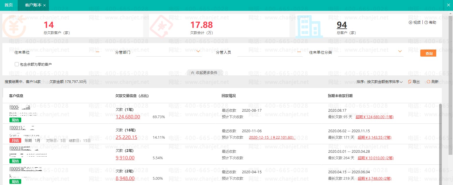 1. 客户账本实时查询打开【好生意】-【资金管理】-【客户账本】,能快速查询客户截止到当前时间点的欠款金额,包括欠款的客户总数量和欠款总金额,同时点击客户欠款总金额,还能联查该客户的往来单据明细。
