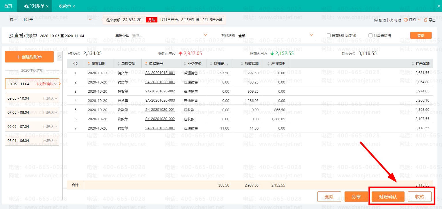 ③客户核对过对账单后,商家再进行对账确认,收款后,好生意会自动更新对账单的收款状态。