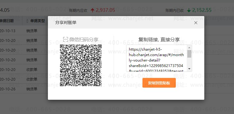 ②点击【生成对账单】后,可以将对账单分享给客户,客户打开就能直接查看对账结果;