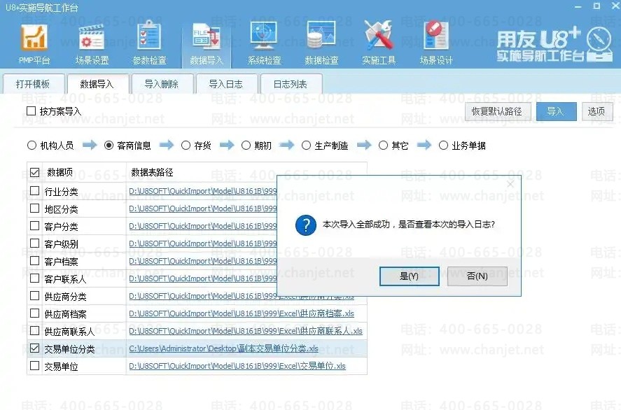 可查看导入日志,重新登录U8企业应用平台,即可看到刚刚导入成功的交易单位分类档案。
