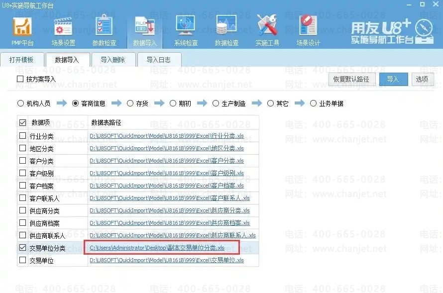 3、数据导入:在实施导航-数据导入-数据导入中,右上角选项里导入方式选择【追加】,点到客商信息页签,勾选【交易单位分类】,选择导入模板路径,点击导入即可。