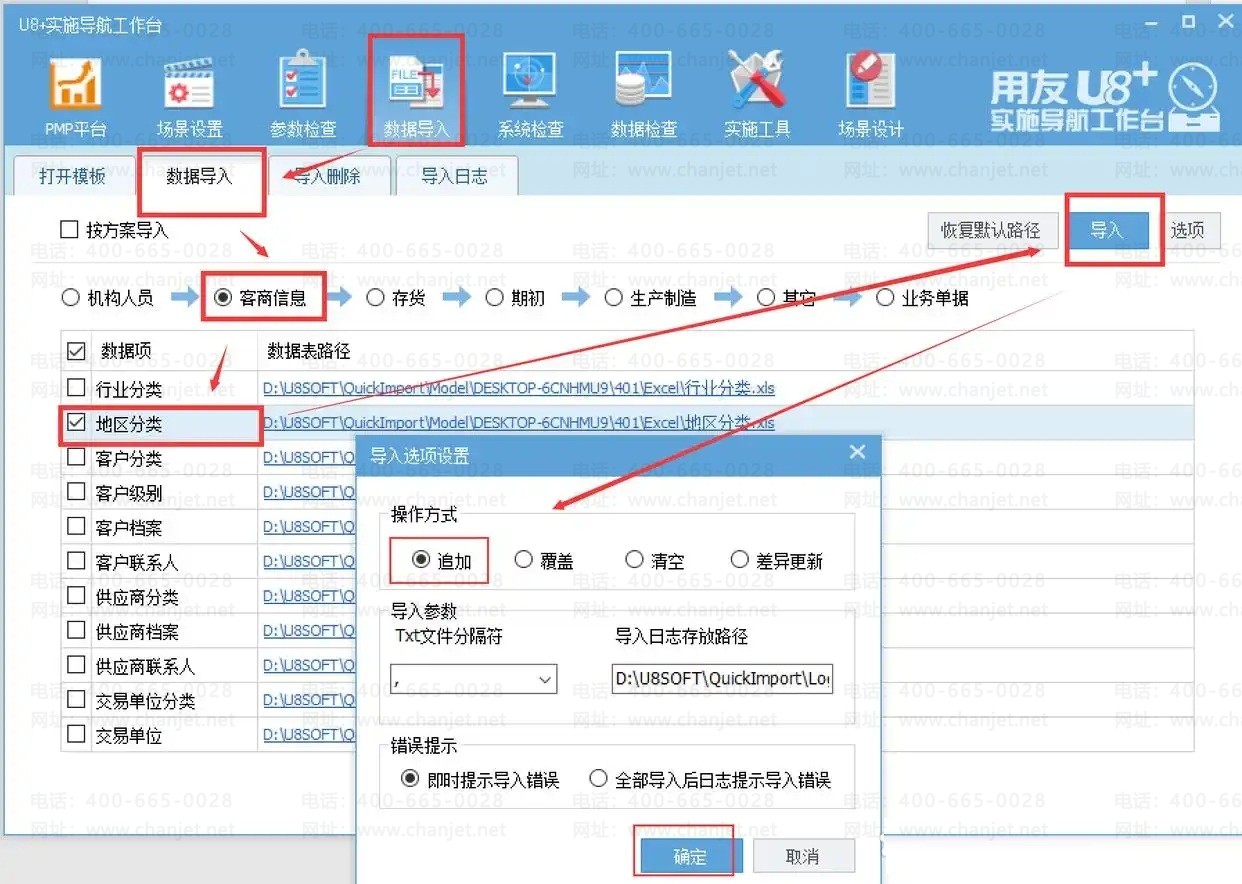 3、在【实施导航-数据导入-数据导入-客商信息-地区分类】导入。新增地区分类时,选项的导入方式选择“追加”;修改已有的地区分类时,可以使用覆盖导入。不支持差异更新、清空导入。