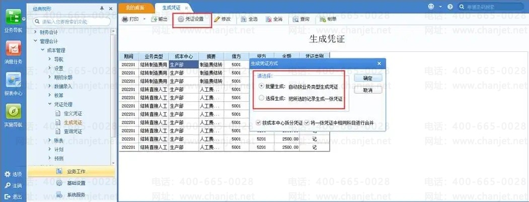 3、【成本管理】-【凭证处理】-【生成凭证】,点“凭证设置”,选择生成一张凭证还是根据业务类型生成多张凭证,支持选择“按成本中心拆分凭证”、“将一张凭证中相同科目进行合并”