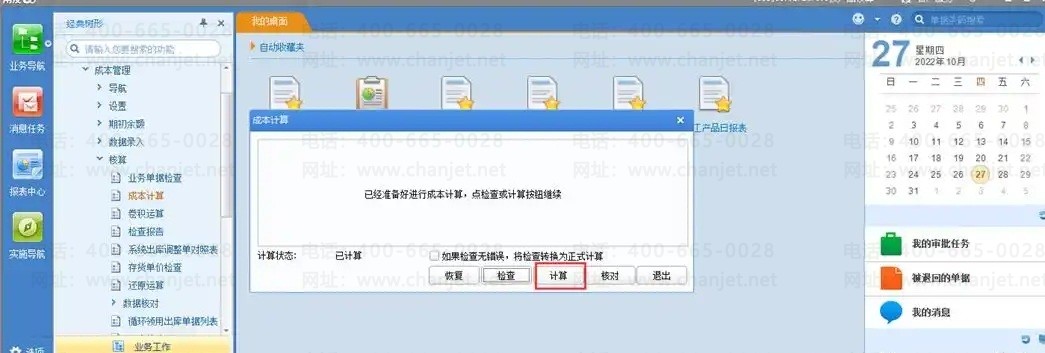 2、【成本管理】-【核算】-【成本计算】或【成本管理】-【核算】-【卷积计算】,点“计算”