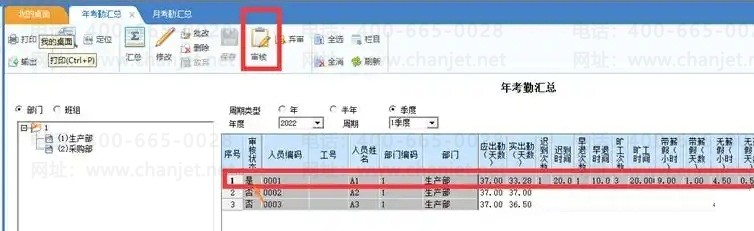 6、确认年考勤数据无误后,点“审核”,审核后,数据变成灰色,无法修改、批改来调整数据