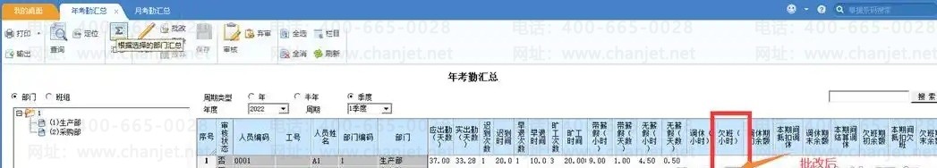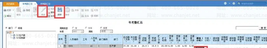 【数据处理】-【年考勤汇总】,点“修改”,如修改A2的调休(小时)为20,点“保存”