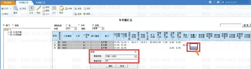 【数据处理】-【年考勤汇总】,选择需要修改的人员,点“批改”,选择要替换的项目和替换的内容