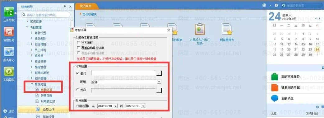 1、【数据处理】-【考勤计算】,选择计算范围和计算时间(选择本月),点“确定”,弹出提示:“日结果计算成功”