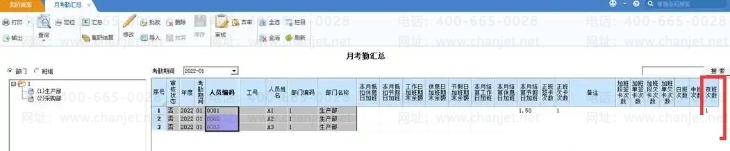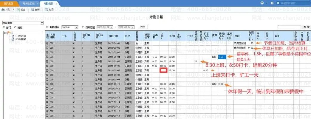 如A1人员本月有迟到、早退,加班、请假、出差等数据可以直接到考勤日报里查看明细记录,
