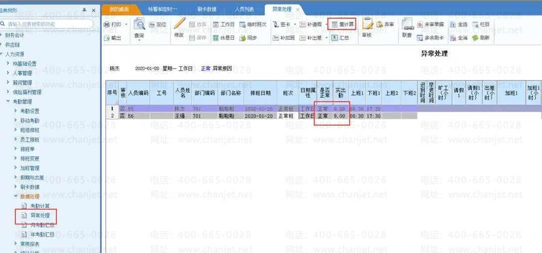 (二) 考勤管理-数据处理-异常处理界面点重计算