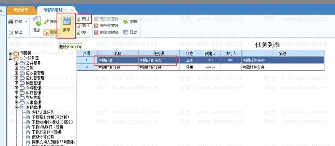 4. 设置好之后点确定,选中此任务点上方的启用并保存,之后会按照该任务的设置去自动执行考勤计算。