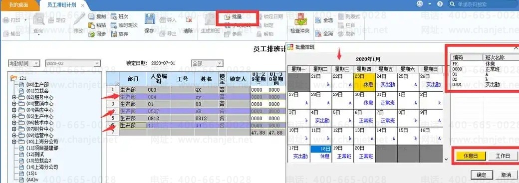 2、选择要调整的人员,点“批量”,弹出界面选择日期右边选择班次和日期属性,点“确定”