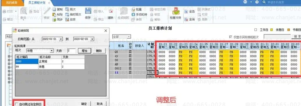 2、选择要排班的人员,点“手动轮转”,弹出界面选择调整的日期范围,设置轮转规律(如果勾选了自动跳过法定节假日,则轮转时会跳过节假日这天),点“确定”