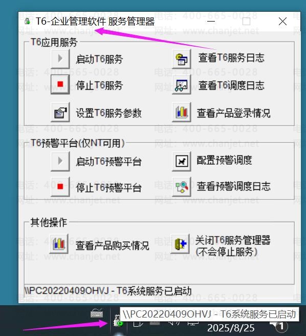 T6应用服务包括: 启动 T6 服务 、停止 T6 服务、设置 T6 服务参数、查看 T6 服务日志、查看 T6 调度日志、查看产品登录情况!