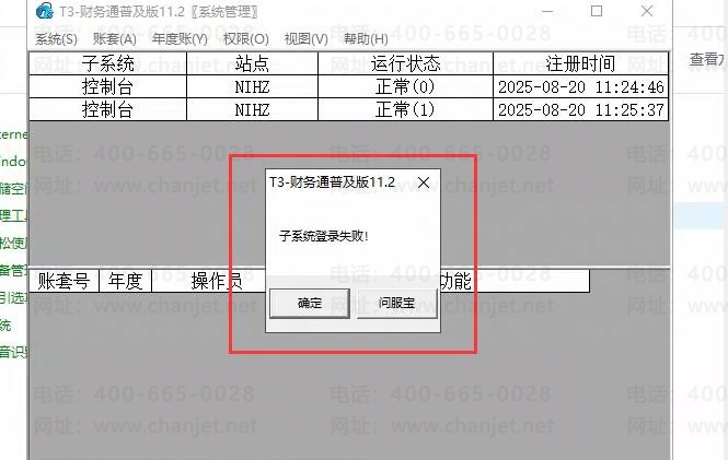 用友T3财务通普及版11.2,安装完成打上官方补丁之后,打开登录没问题,点击模块就显示“子系统登录失败!”,如下图所示