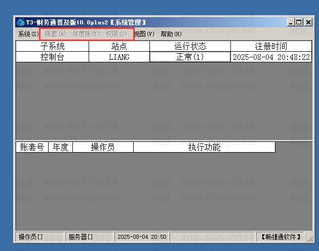 用友T3财务通普及版10.8plus2版本,又名叫用友T3财务通普及版10.8.2金盘,一切安装完成,使用admin账号登录系统管理后“账套”和”权限”都是灰色且无法操作,如下图所示