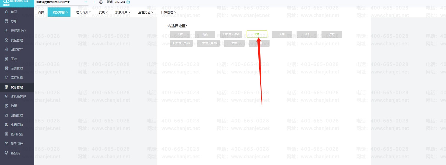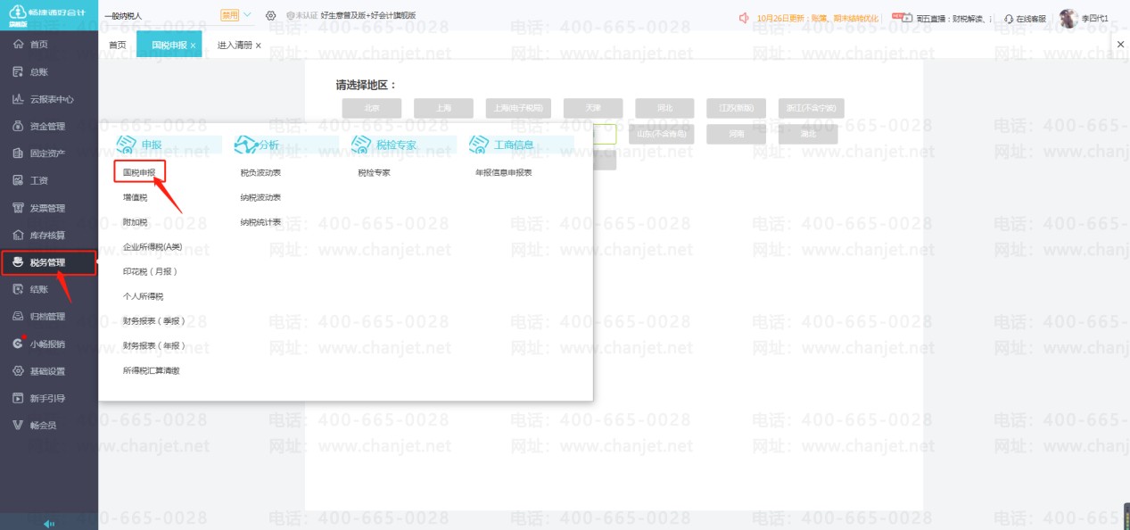 点击左侧菜单栏【税务管理】-【国税申报】,进入选择地区页面。只有北京、上海地区是支持申报地区。选择地区后,进入具体申报页面。
