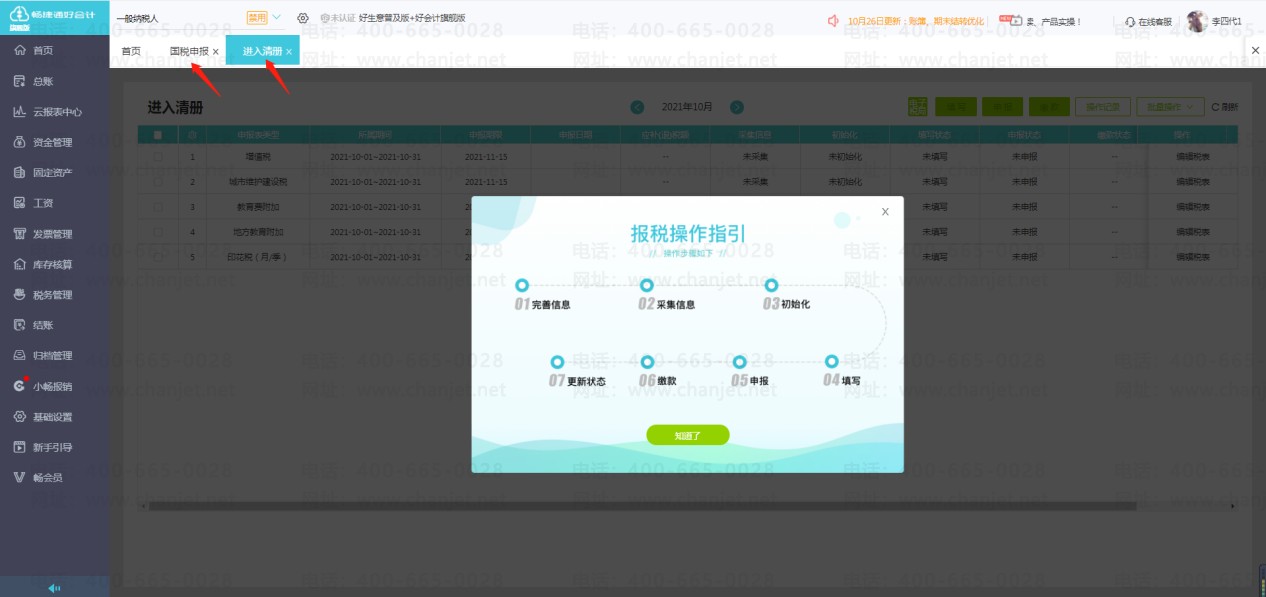 点击左侧菜单栏【税务管理】-【国税申报】,进入选择地区页面。选择地区后,进入具体申报页面,即【进入清册】页面。