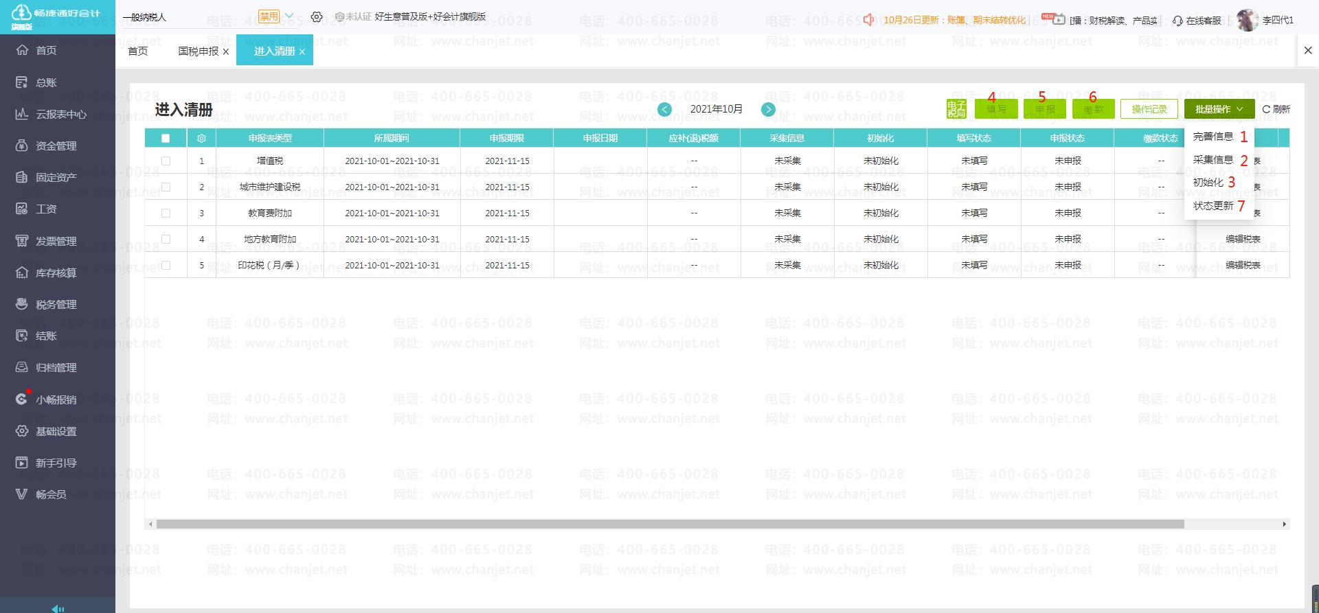 第七步:状态更新。各个步骤操作过程中,都可以点击右上角【批量操作】中的状态更新,同步税局端申报状态。