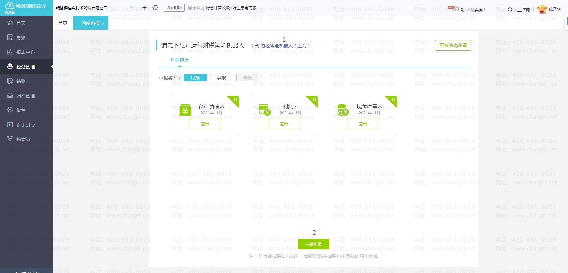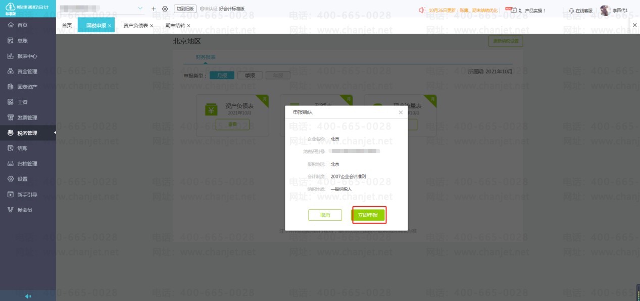 进入好会计【税务管理】-【税务申报】,北京地区的客户可使用一键报税