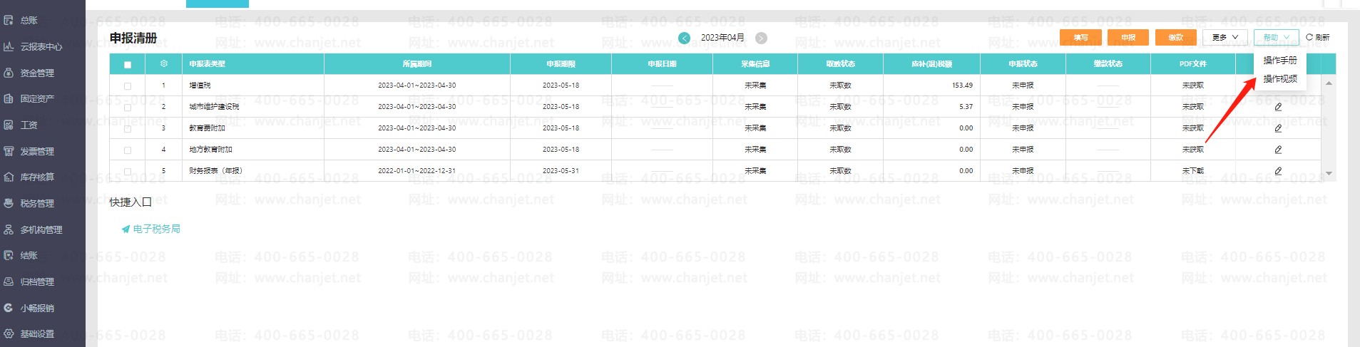 进入好会计【税务管理】-【税务申报】,选择对应地区后,点击右上角帮助可查看一键报税的操作手册和视频