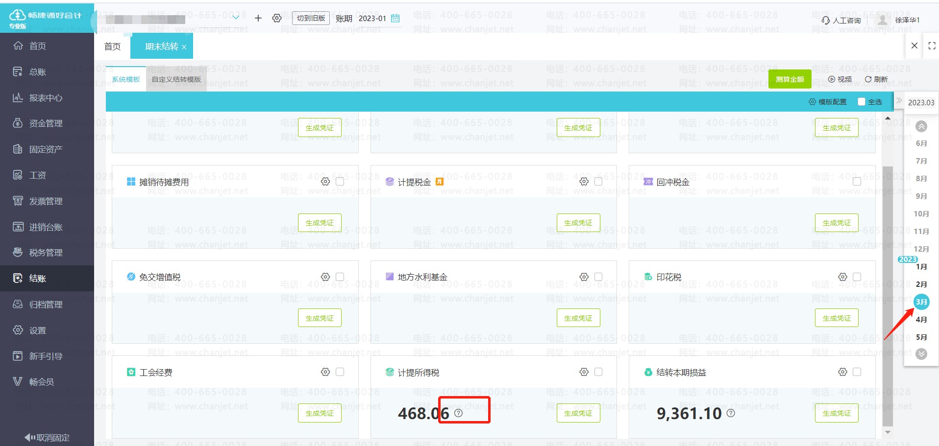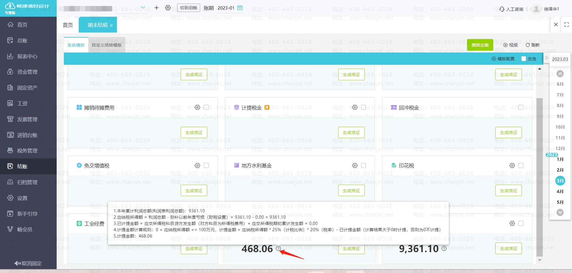 ②、可以使用软件的【期末结转】功能去计提享受减免优惠政策之后的企业所得税,系统会智能计算。点击【结账】-【期末结转】-【测算金额】测算所得税,可以点击生成凭证,生成计提所得税的凭证,如果想看具体的数据计算过程,可以点击【计提所得税】结转模板处,数字后方的【?】查看计算过程。