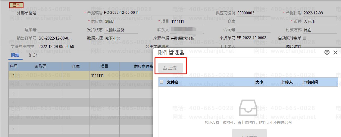 3、取消该勾选后,已审核的单据打开附件功能,上传按钮为灰色,无法上传附件