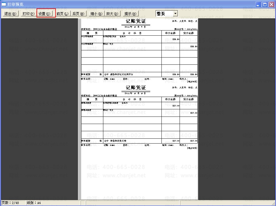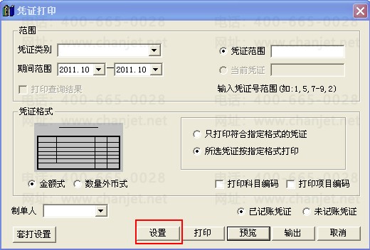 预览后可点击预览界面的“设置”,修改凭证打印的页边距和凭证间距等。