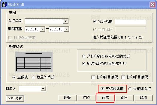 4、凭证已经记账的勾选“已记账凭证”,未记账的勾选“未记账凭证”后点击“预览”;