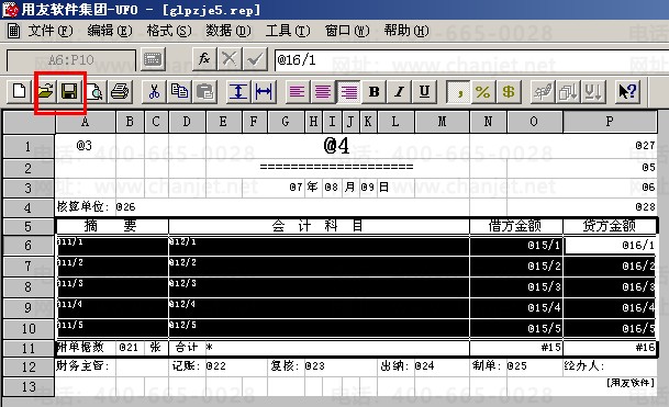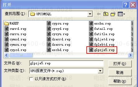 2、双击打开ufow.exe,点击“文件”菜单下的“打开”,选择C:\WINDOWS\system32\UFCOMSQL路径下的glpzje5.rep,点击打开;