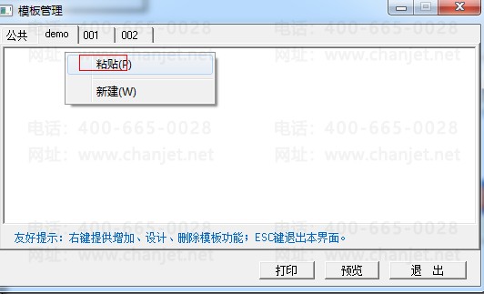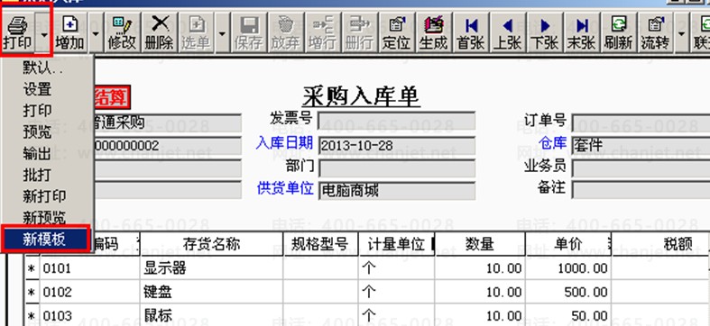 1、依次点击“采购入库单”—“打印”—“新模板”,进入“模板管理”界面后将“公共”下的打印样式复制到“demo”(当前操作员)下