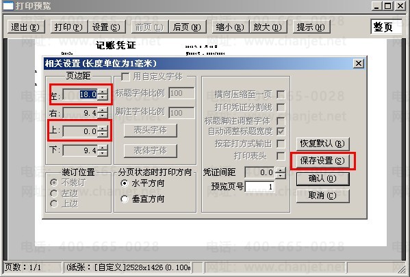 4、调整左边和上边的页边距,之后点击“保存设置”。如下图所示: