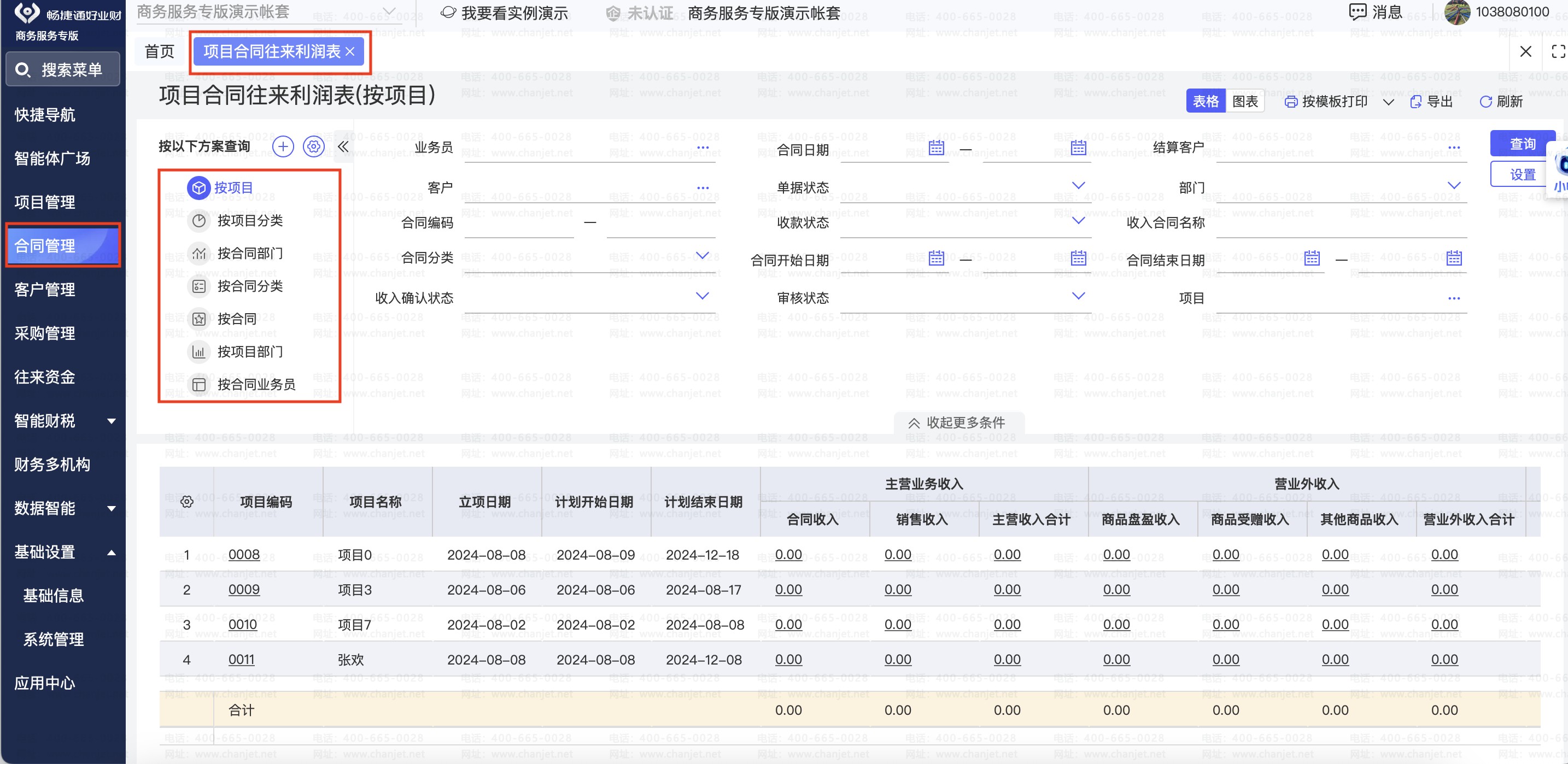 多维度利润分析:所有与项目相关的收入、成本、费用单据自动汇总。管理层可随时通过【项目看板】、【项目合同往来利润表】等报表,实时查看每个项目的收入、成本、费用、毛利及毛利率,数据一目了然。