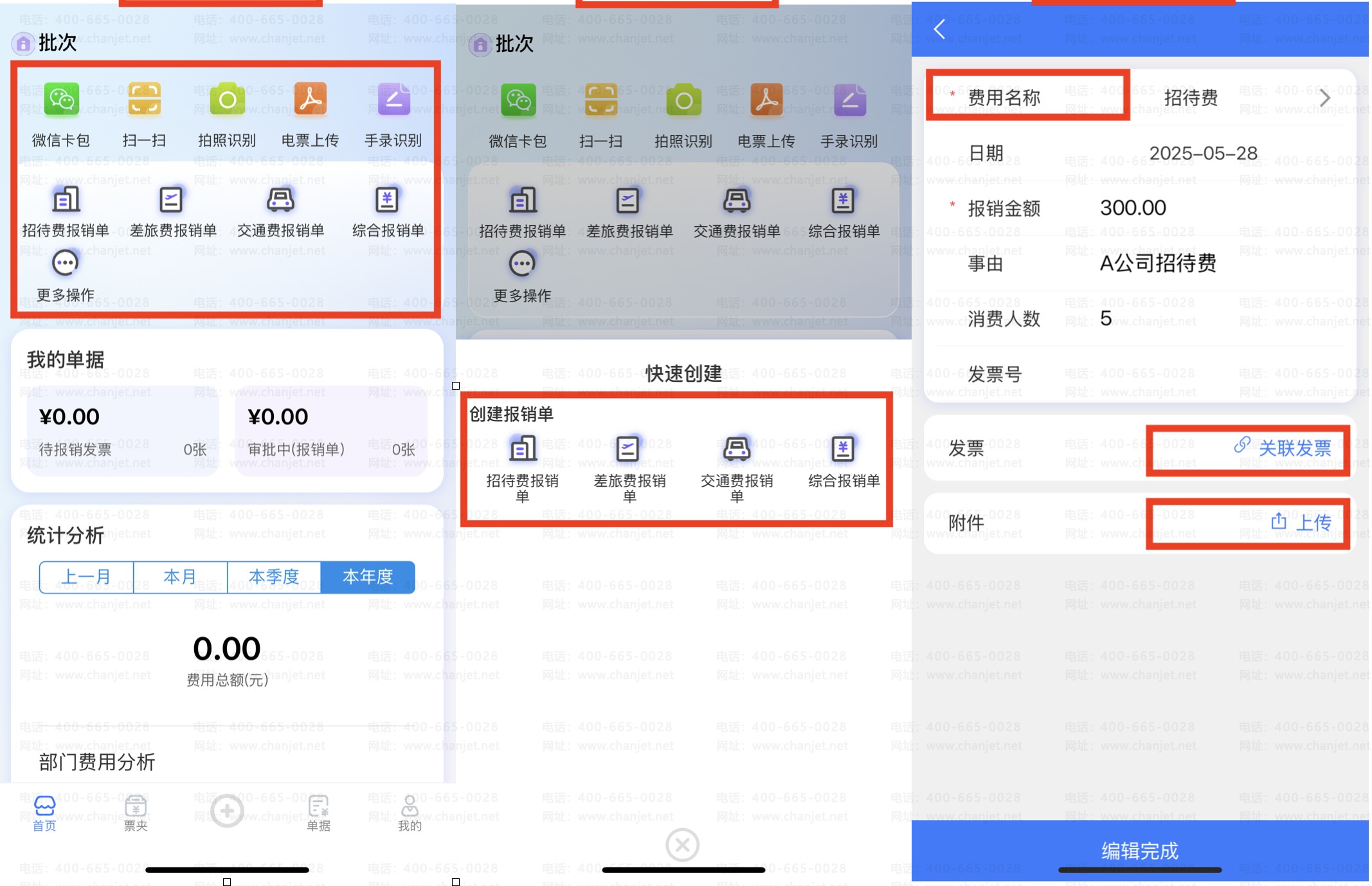 员工报销:员工通过【小畅报销】在手机端提交差旅、招待等报销,同样可关联到具体项目,审批通过后数据自动流转。
