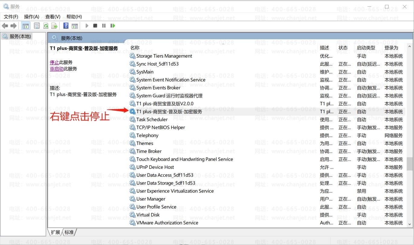 3、找到"T1 plus-商贸宝-普及版-加密服务",鼠标右键,停止"T1 plus-商贸宝-普及版-加密服务"。