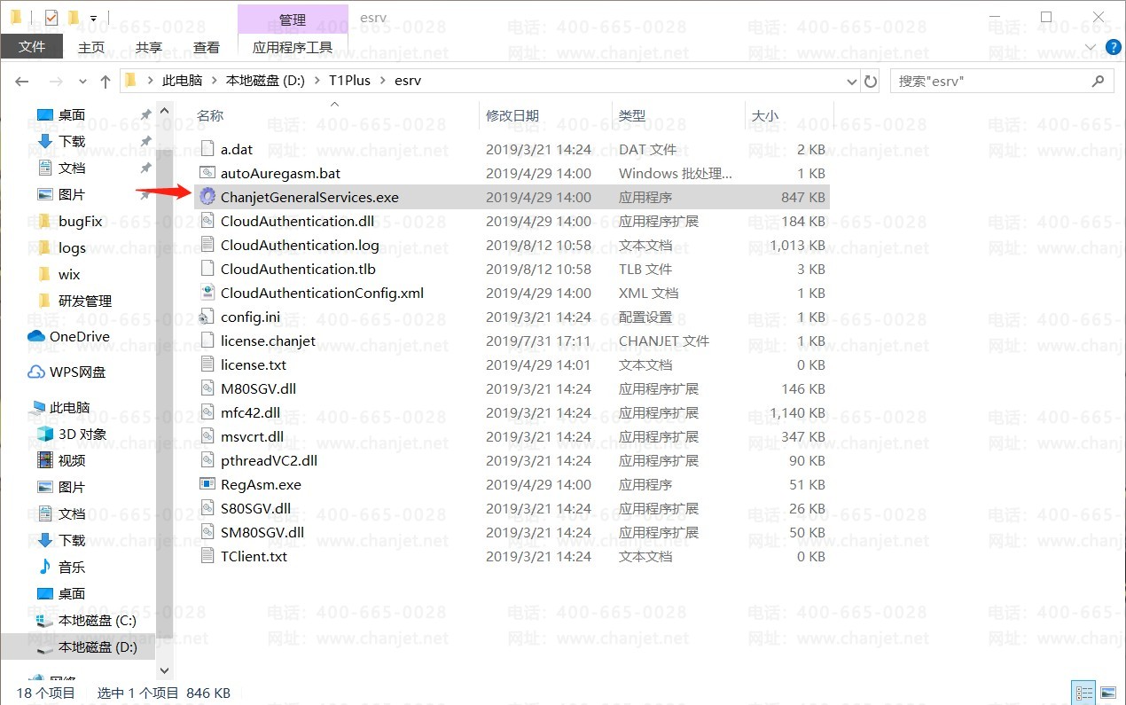 4、进入到 T1Plus 安装目录下找到文件夹 /T1Plus/esrv,找到ChanjetGeneralServices.exe 文件。