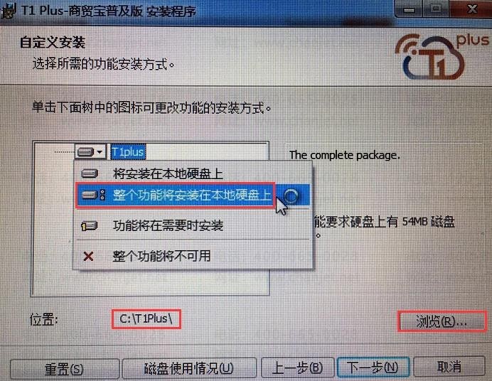 3、选中“T1plus”,点击“将整个功能安装在本地磁盘上”,点击“位置”后的“浏览”,选择 C 盘之外的其他磁盘,点击下一步