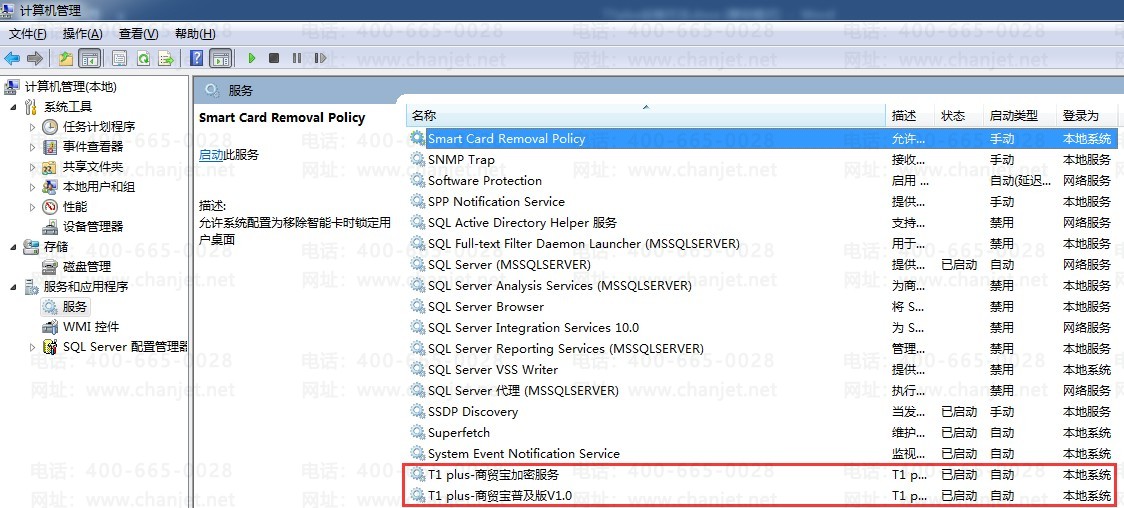 6、T1plus 安装之后会自劢生成两个服务,分别是:“T1 plus-商贸宝加密服务”和“T1 plus-商贸宝普及版 V1.0”。这两个服务存在并且可以正常启劢则说明安装成功
