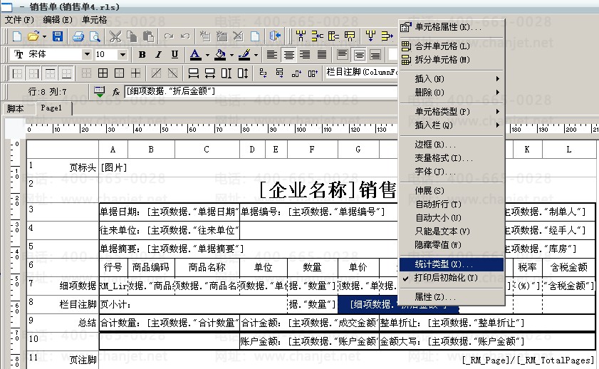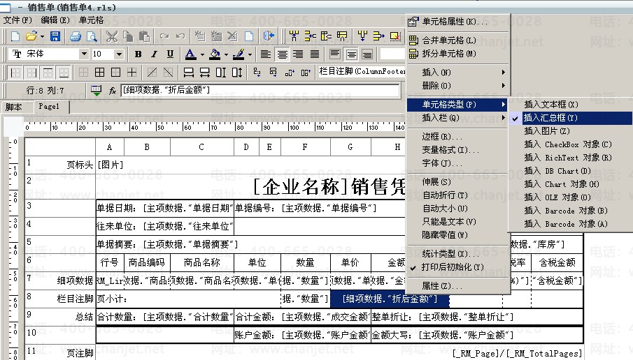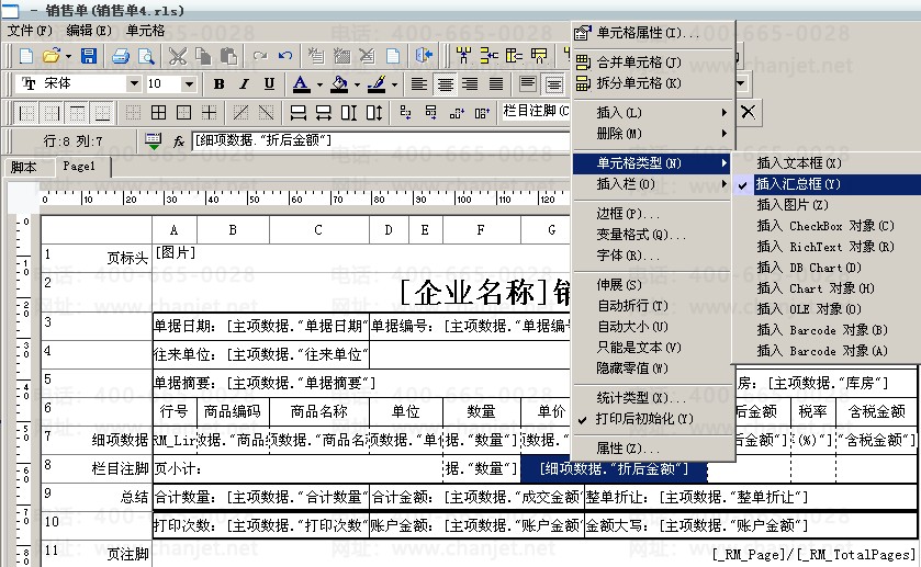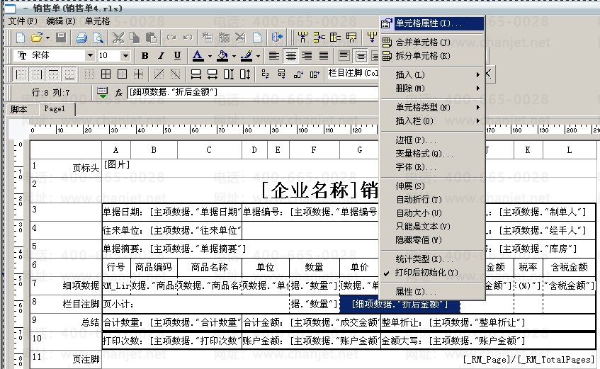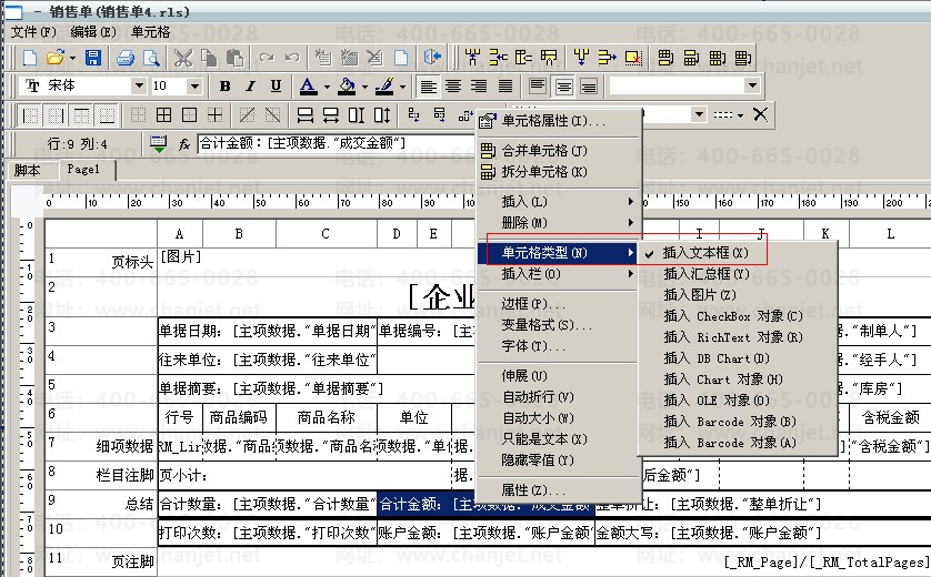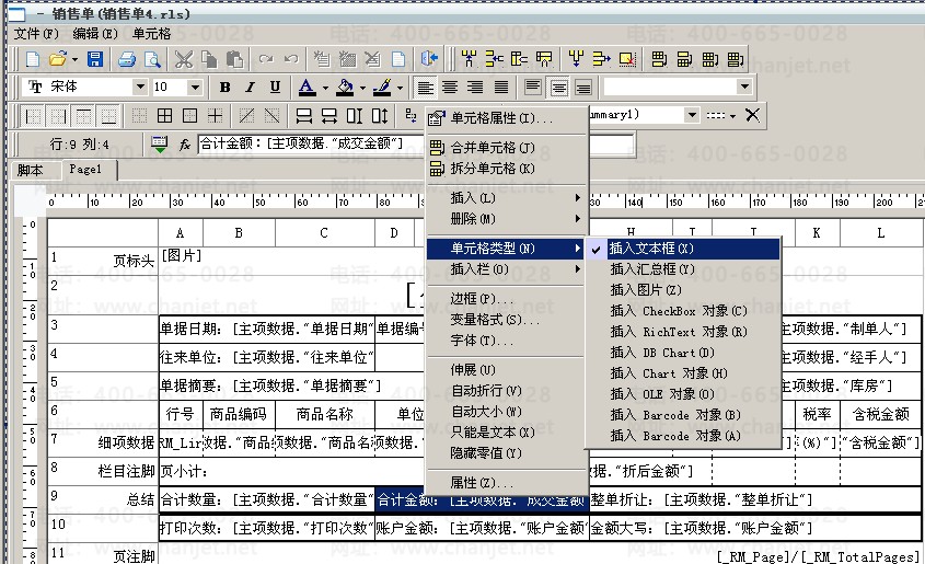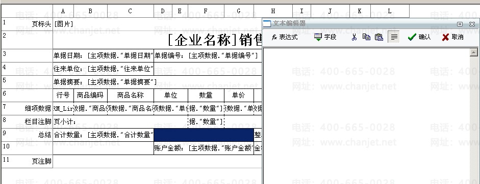 1、进入销售单的打印报表设计,选择“总结”行中对应的单元格双击进入文本编辑器中: