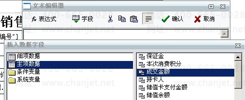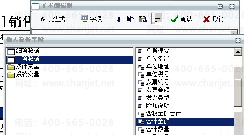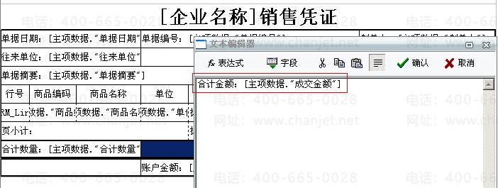 2、在文本编辑器中手动输入“合计金额:“后点击“字段”选择主项数据中的“成交金额”或“合计金额”: