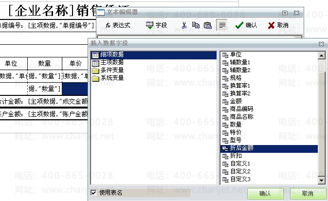 1、选中“页小计“行中准备显示金额小计的单元格双击进入文本编辑器中,点击”字段“选择细项数据中的”折后金额“。一般金额小计都是选择折后金额的,因为单据的成交金额是按折后金额计算的。
