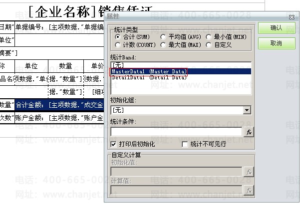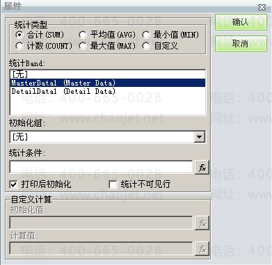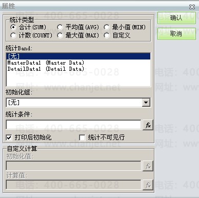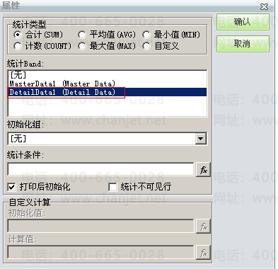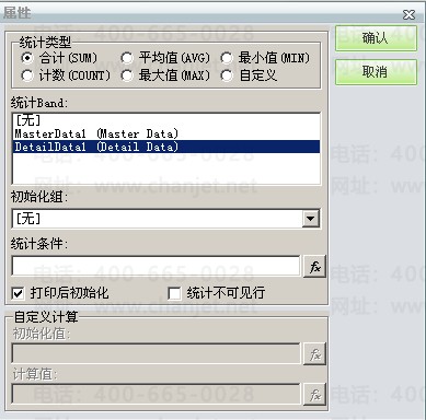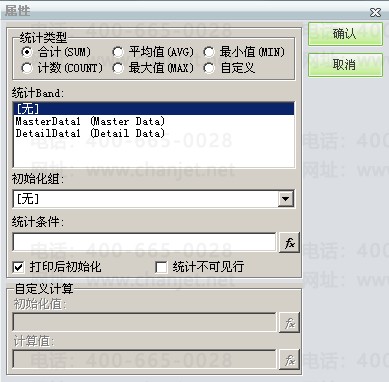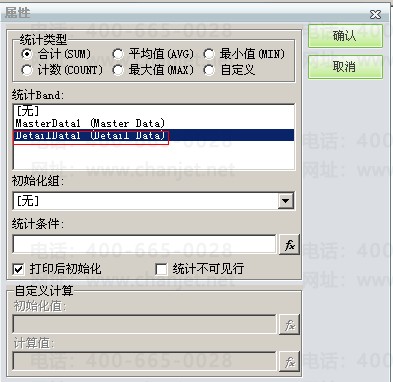 上述可见单元格数值是否取值正确除了由取数公式决定,单元格的属性也是非常重要的。如果单元格是直接取一个字段值则可将单元格的单元格类型设置为“插入文本框”,如果单元格是取某字段的汇总值,则需将单元格的单元格类型设置为“插入汇总框”,并对统计类型做相应的设置,细项数据字段选择”DetailDatal (Detail Data)“,主项数据字段选择“MasterDatal(Master Data)”,不能混淆。