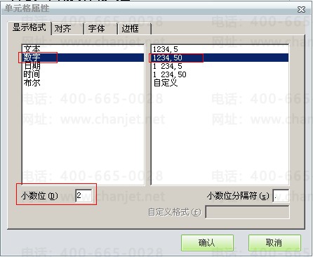 5、如要显示两位小数的话,可选中单元格右键点击“单元格属性”,选中“数字”修改小数位为2,右边数字选择:1234,50(重要,必须选择):