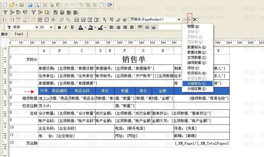 1、进入打印报表设计,选中标题行将其设置为“分组标头”。