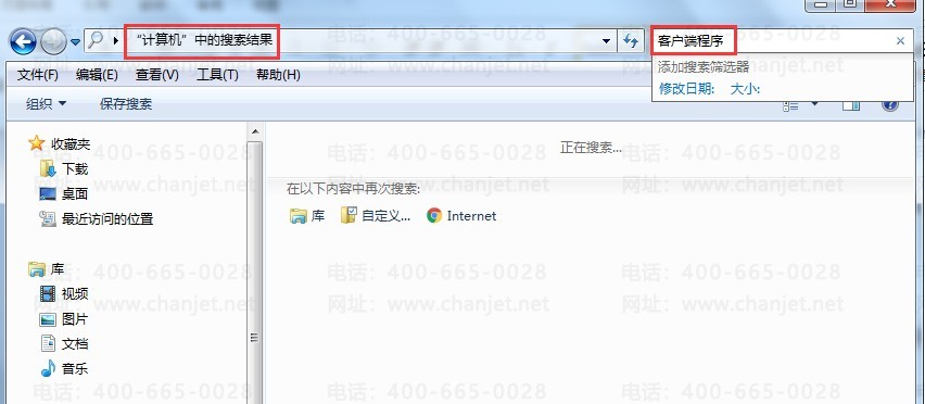 1、软件卸载重新安装后,在电脑桌面或是所有程序中都不会留下记录,所以直接打开计算机或是我的电脑,在搜索框中直接输入“客户端程序”,搜索时不要选择具体磁盘, 直接全盘搜索