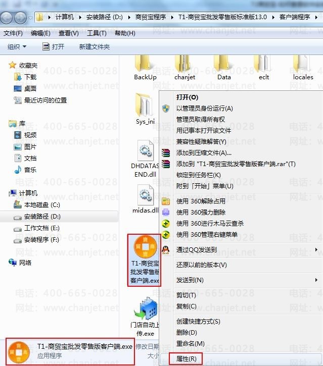3、打开 D 盘,商贸宝程序下,T1-商贸宝批发零售版标准版 13.0 文件夹,再打开客户端程序文件夹,找到“T1-商贸宝批发零售版客户端.exe”,右键属性