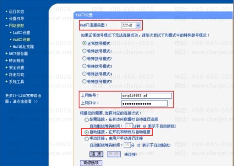 B、在路由器左边找到“WAN口设置”,点击进入WAN口设置界面,WAN口连接类型选择PPPoE,输入上网账号和上网口令,且连接方式这为:“自动连接,开机和断线后自动连接”,并保存;